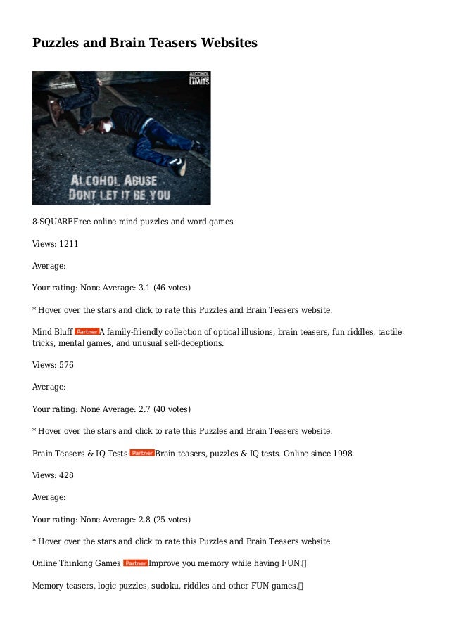 If you need a brain teaser, mind puzzle or riddle, we are the place to get it. Play titanic online | online puzzles and brain teasers Smartgameslive.com is the online center for smartgames. Brain teasers, riddles, puzzles and more. Here is the most tricky and hard brain teaser puzzles. Download brain teaser riddles, questions, and answers, games, etc. We have given the brain teasers pictures with answers. Brain puzzles and logic puzzle books: All the brain teasers and math puzzles are interactive with immediate scoring. We have tons of free printable brain teasers for kids and adults, with the answers provided. User submitted and ranked brain teasers, riddles, quizzes, trivia, logic problems and mind puzzles. Along with these features, the over 200,000 members can join a large online community of others who enjoy brain teasers, puzzles, and quizzes. Jul 22, 2019 · brain teasers and math puzzles.